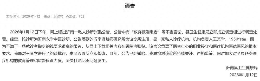 月12日下昼2026年1,私家诊所张贴告示网上曝出沂南一,端患者”等失当舆情告示中有“放弃低。立考察组举办考察治理县卫生强健局顿时成。