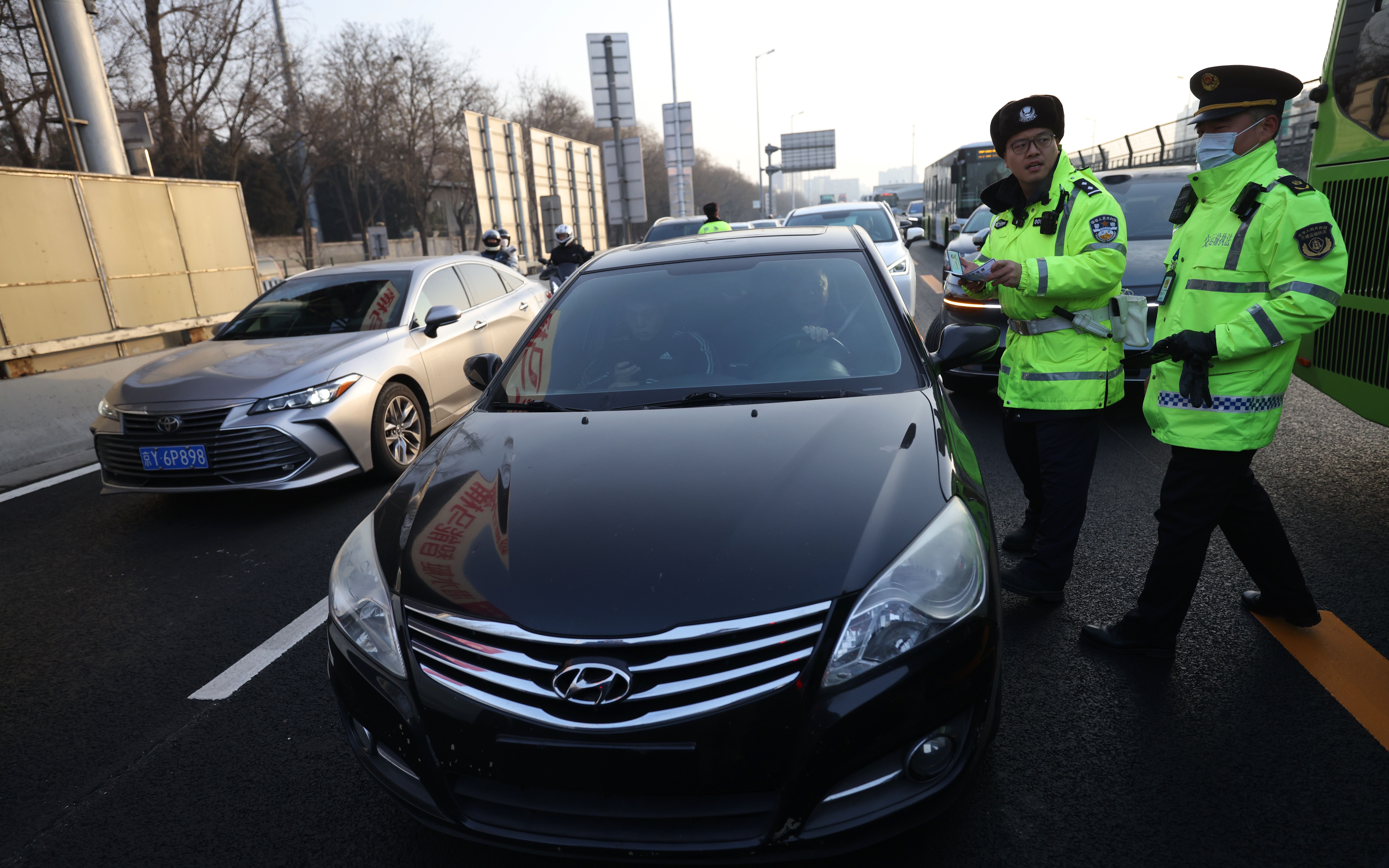 15日1月,被交警和交通法律职员拦停一辆吊挂临牌的“黑车”,法律考查回收联络。 王贵彬 新京报记者摄